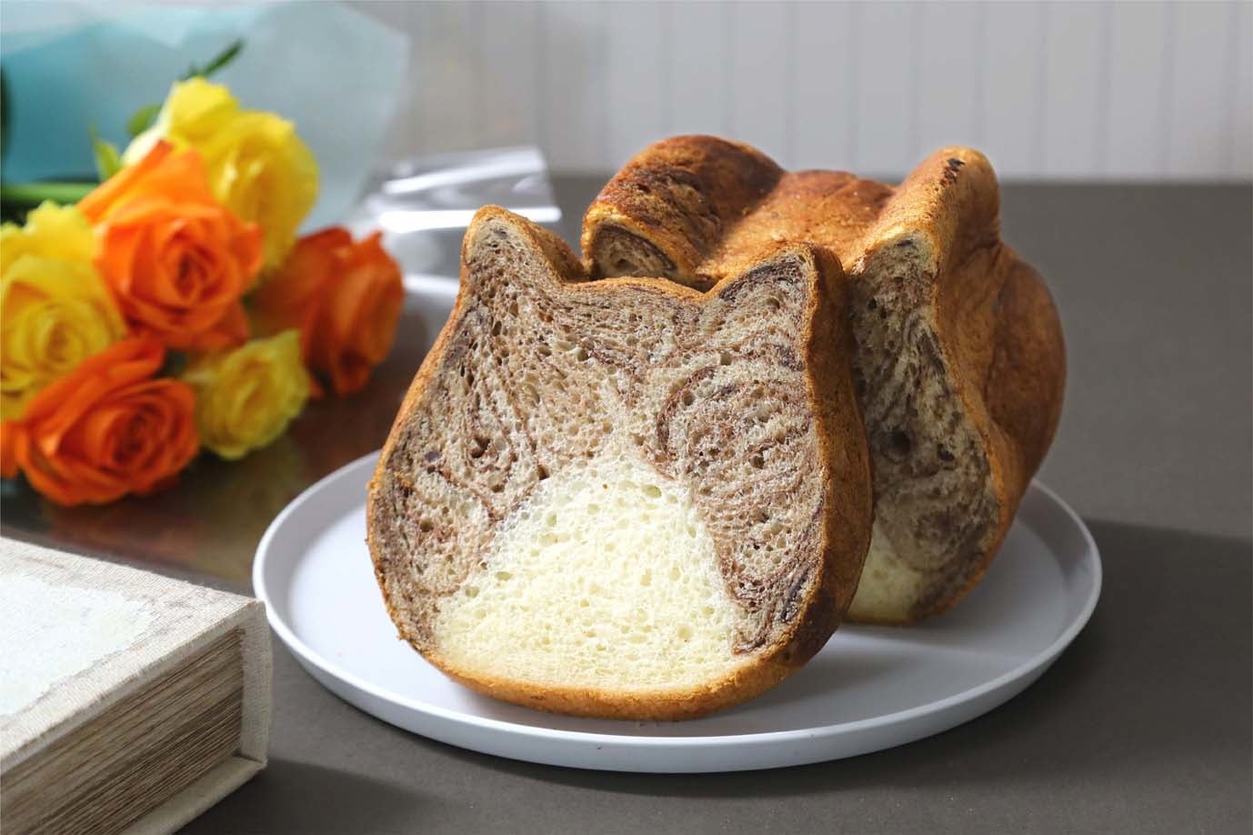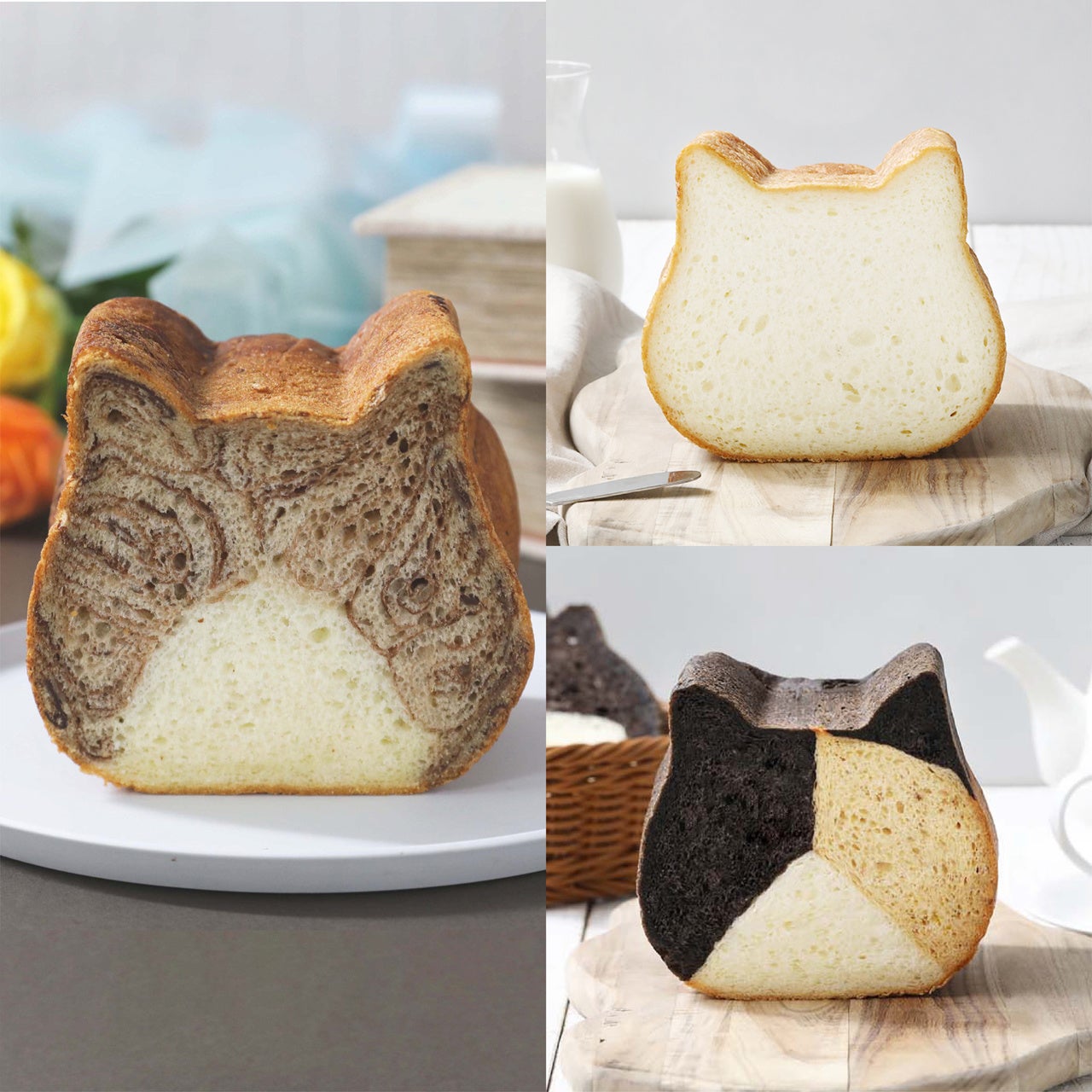 三毛猫の白、茶色、黒色模様をプレーン、キャラメル、ブラックココアで表現した見た目も三毛猫そのままなねこねこ食パンです。